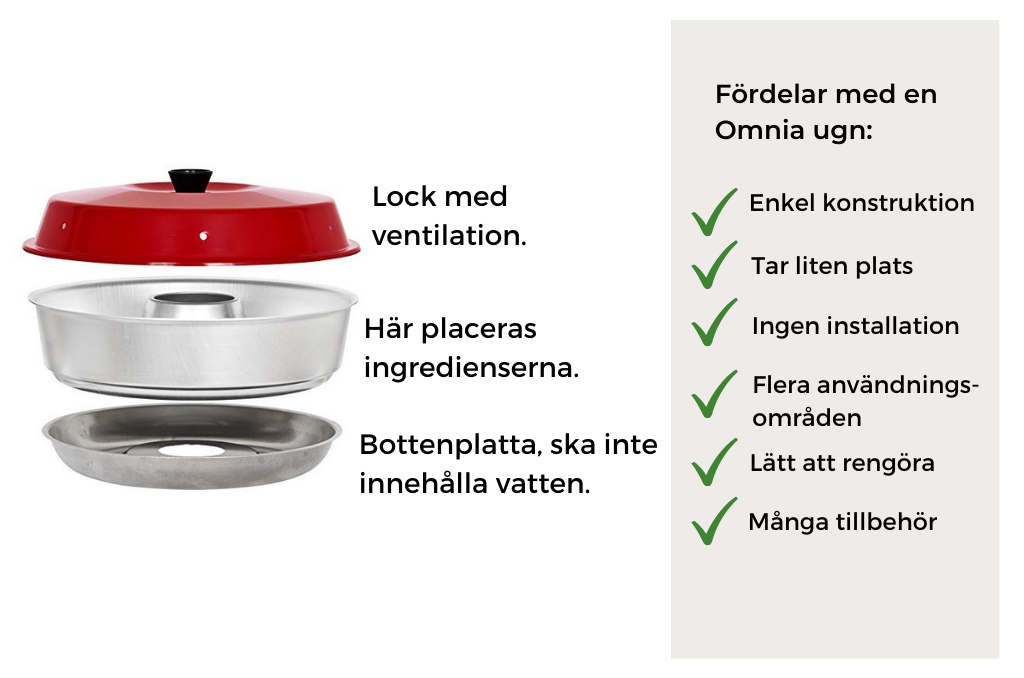 Omnia ugn är en tredelad miniugn att använda till gasolspisen, elplattan eller spritköket. Det är en praktisk portabel ugn att göra ugnsmat eller baka bröd i. Perfekt för husbilen, husvagnen, båten eller när du tältar där du inte har tillgång till en fast ugn.