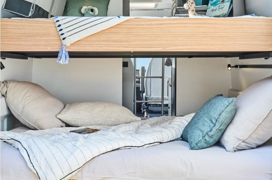 - Ta med många på resan, här hittar vi fyra fasta långbäddar längst bak samt två platser i den nedsänkbara taksängen.