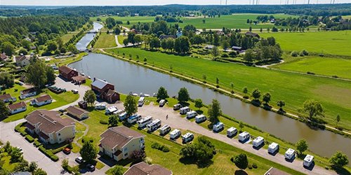 Ställplatsen ligger vackert vid Göta Kanal med gästhamnen som närmaste granne.