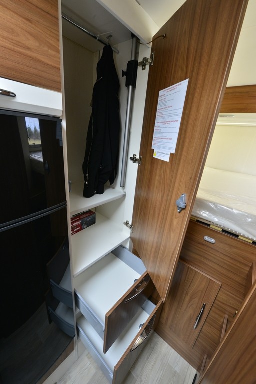 Mellan kök och sovrum hittar vi garderoben. En rymlig sådan. Med två lådor längst ner.